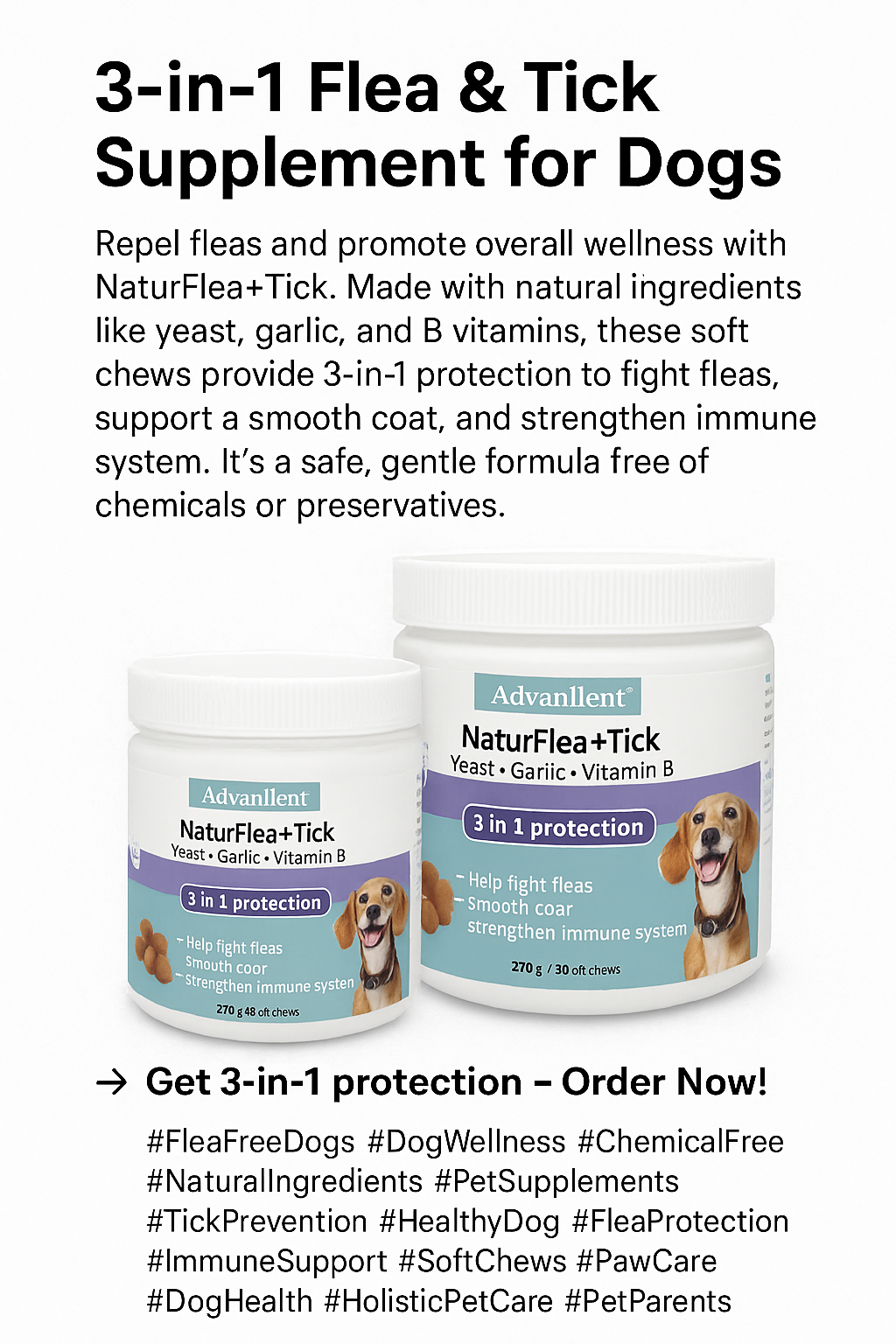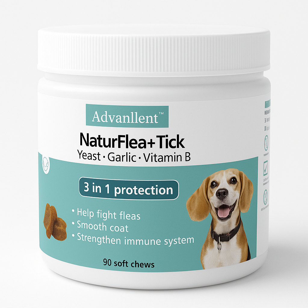 Advanllent NaturFlea+Tick is a powerful 3-in-1 protection formula that helps fight fleas, supports a smooth and shiny coat, and strengthens your dog’s immune system. Made with garlic, brewer’s yeast, and B vitamins, this chemical-free chew creates a natural barrier against fleas, ticks, and mosquitos. Works within 30 days of consistent use and is safe for dogs and cats. 100% money-back guarantee.