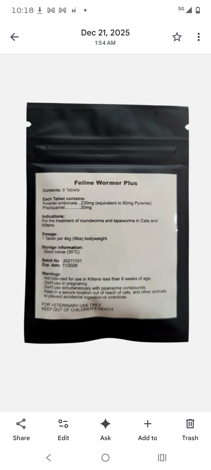 • Indications: Treatment of roundworms and tapeworms
