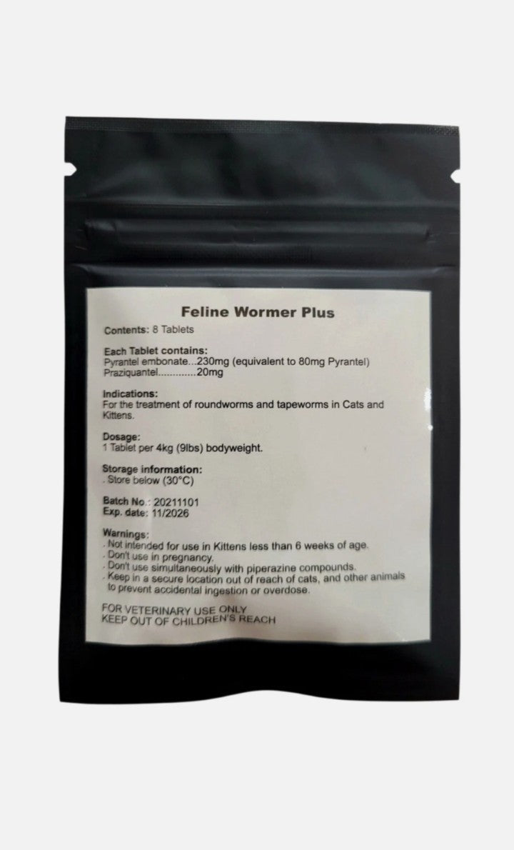 Feline Wormer Plus is a broad-spectrum deworming tablet formulated for cats and kittens to help treat common intestinal parasites. Each tablet contains pyrantel embonate and praziquantel, a proven combination used to target roundworms and tapeworms.