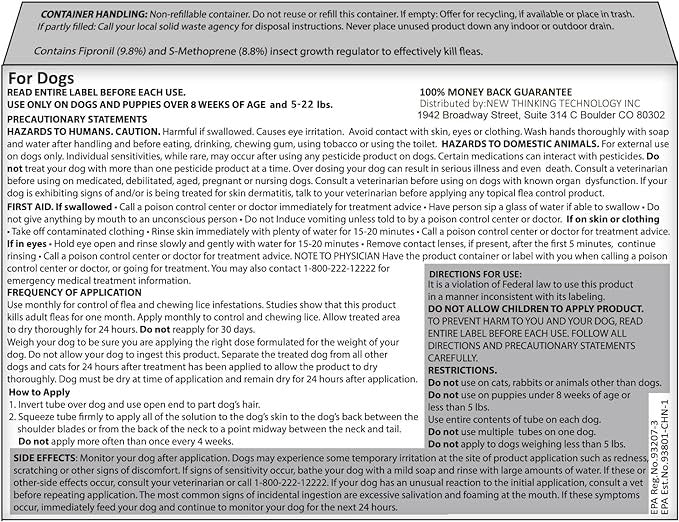 EFFECT: provides fast-acting long-lasting, waterproof treatment and control of fleas, ticks, chewing lice, and sarcoptic mites. Use ONLY on dogs weighing minimum of 5-22 lbs. Suitable for females raising pups, lactation and only 8 weeks puppies.