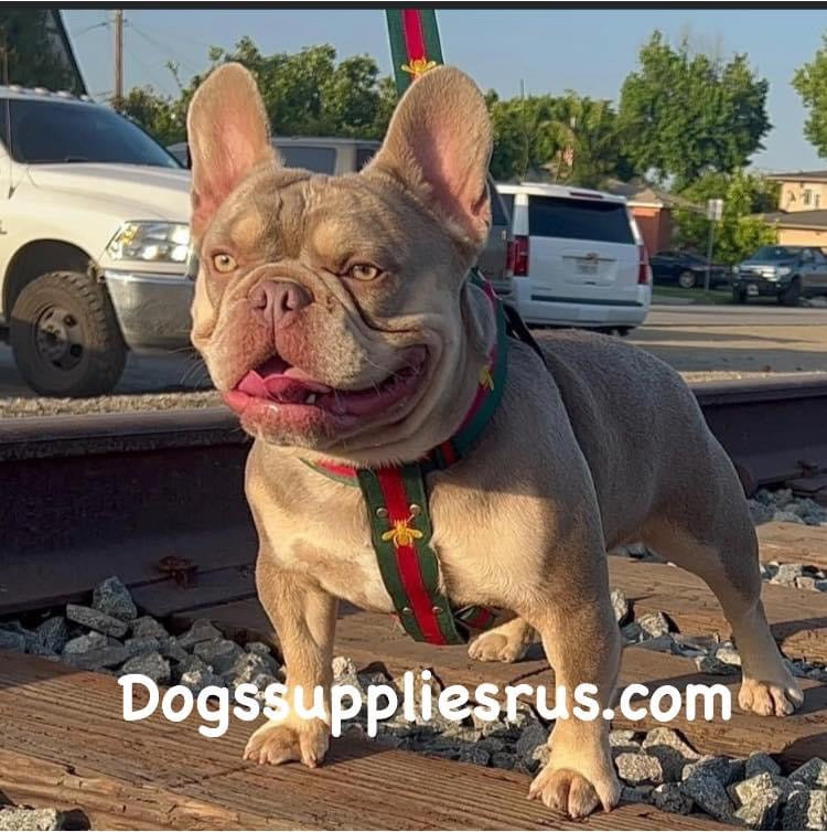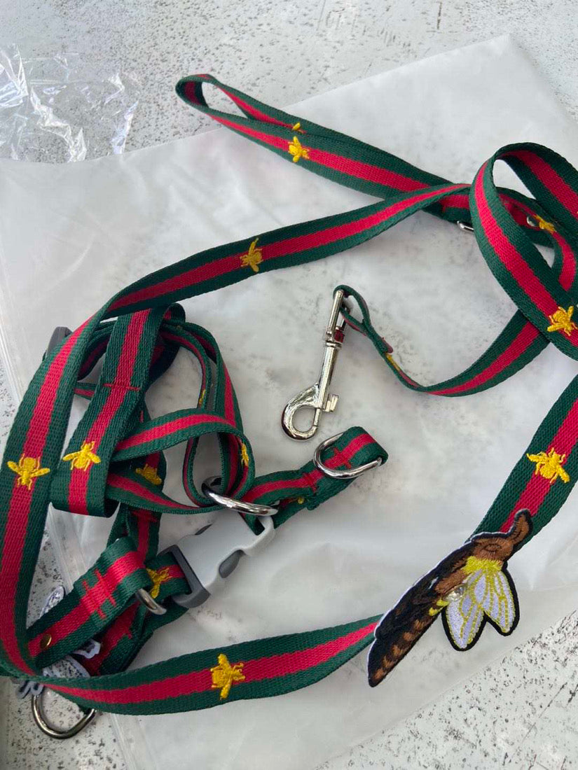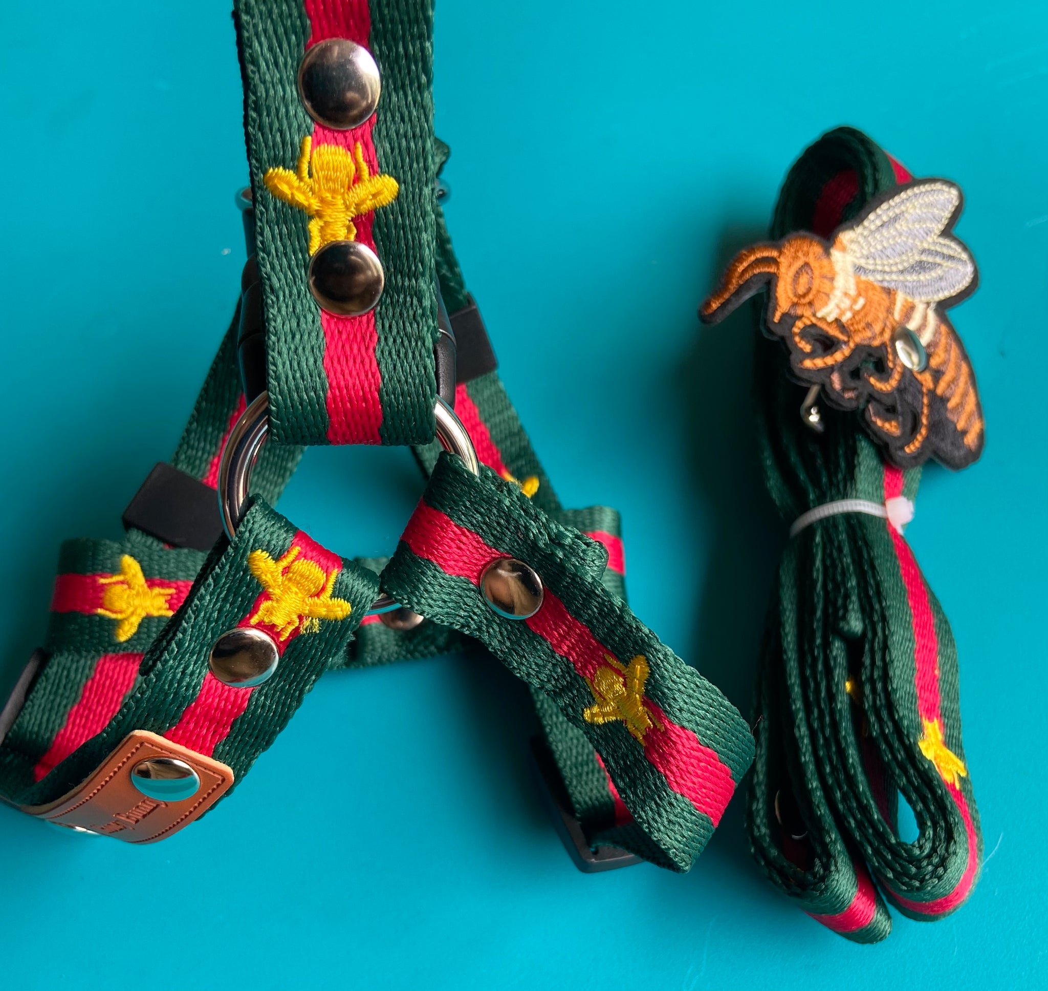 This step in dog harness and leash is made of nylon. These step-in harnesses for dogs are sold as complete designer harness, collar, and leash set for dogs.