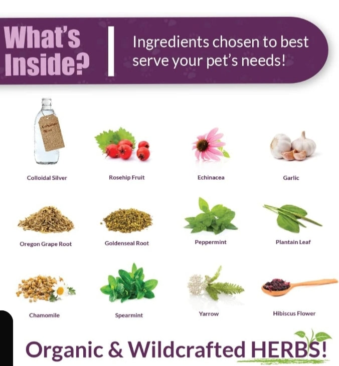 “Proprietary Blend of (Colloidal Silver, Organic Chamomile Flowers, Organic Yarrow, Organic Plantain Leaf) 98 mg”