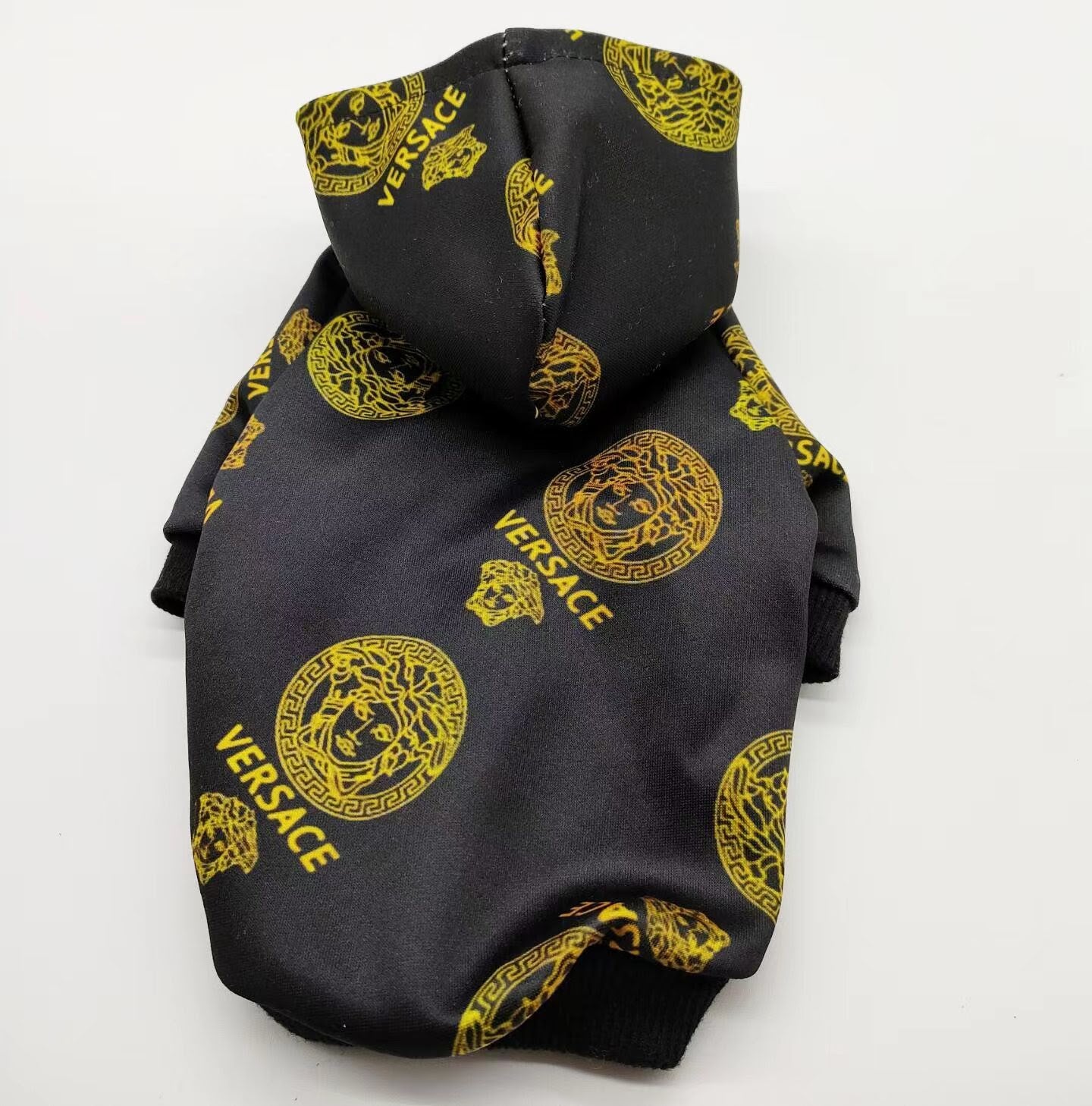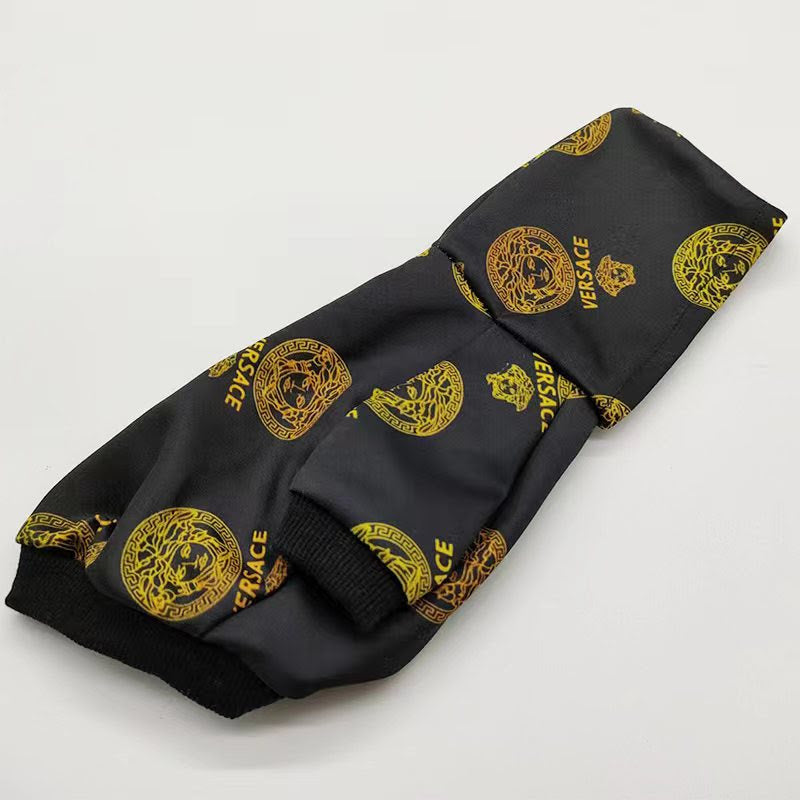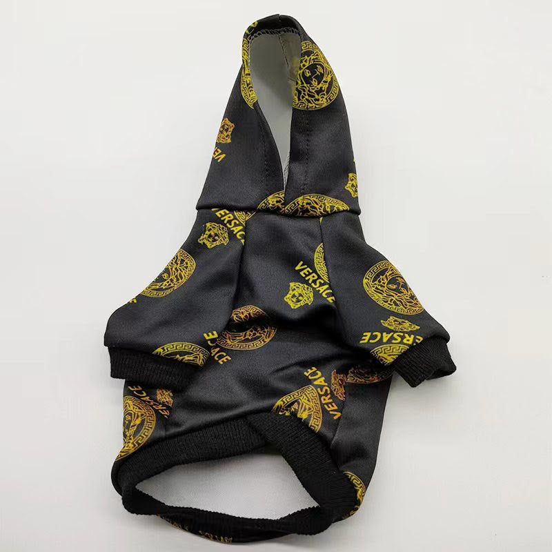 Elevate your pet's fashion stature with the Versace Noir & Gold Canine Hoodie Jacket. Epitomizing Versace's iconic combination of boldness and luxury, this black jacket is accentuated with gold detailing, reflecting the brand's penchant for opulence.